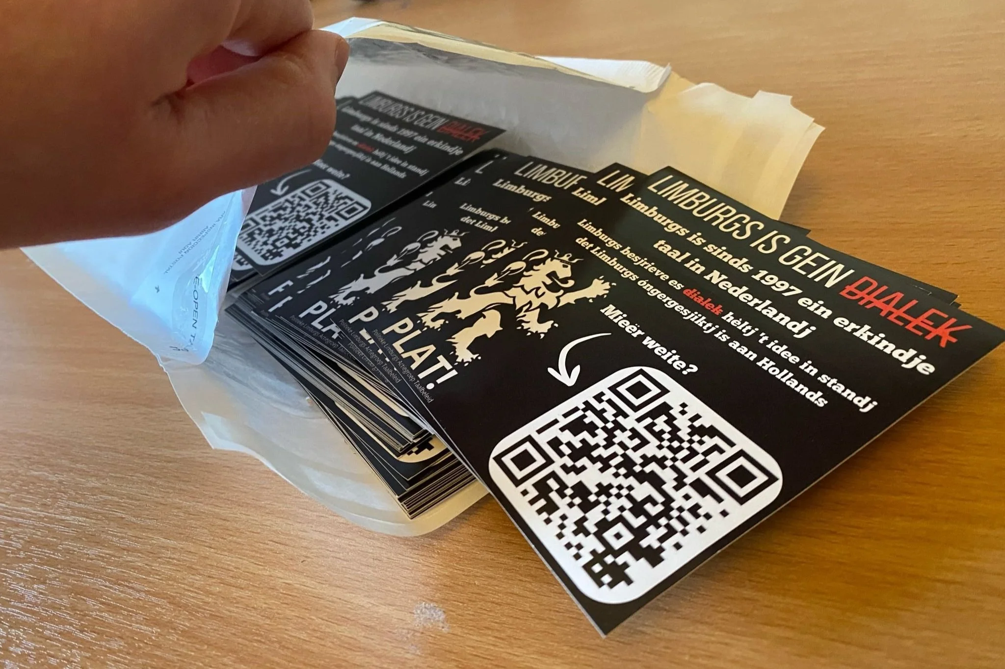 De stickers zien glanzend en hebbe ein breuklien op d'n achterkant waodoor ze gemekkelik loskómme. De QR-code geit nao www.platactie.org/gein-dialek.